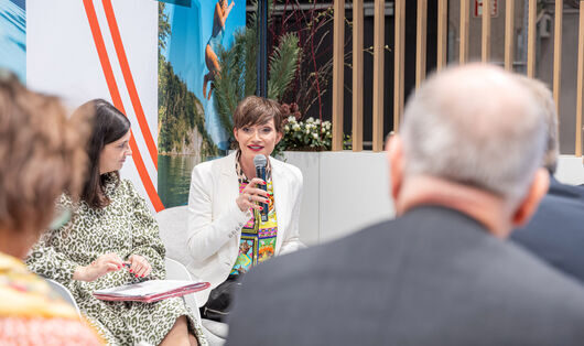 ÖW-CEO Astrid-Steharnig Staudinger beim Pressegespräch auf der ITB 2026; (c) ÖW/Philipp Gaiko