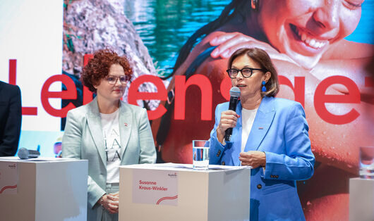 v.l.n.r.: Elisabeth Zehetner, Tourismus-Staatssekretärin im Bundesministerium für Wirtschaft, Energie und Tourismus, und Susanne Kraus-Winkler, Bundesspartenobfrau Tourismus und Freizeitwirtschaft in der Wirtschaftskammer Österreich; (c) ÖW/Philipp Gaiko