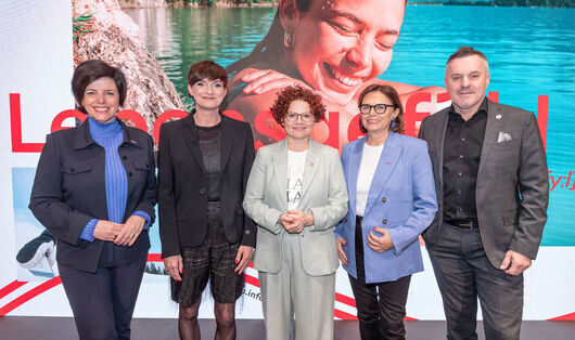 v.l.n.r.: Karin Seiler (Geschäftsführerin Tirol Werbung & Sprecherin der Landestourismusorganisationen), Astrid Steharnig-Staudinger (Geschäftsführerin Österreich Werbung), Elisabeth Zehetner (Tourismus-Staatssekretärin im Bundesministerium für Wirtschaft, Energie und Tourismus), Susanne Kraus-Winkler (Bundesspartenobfrau Tourismus und Freizeitwirtschaft in der Wirtschaftskammer Österreich), Klaus Panholzer (Präsident Austrian Leading Sights und Geschäftsführer der Schönbrunn Group); (c) ÖW/Philipp Gaiko