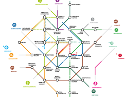 Lesen der Zukunftsmap: Ein Megatrend entspricht sozusagen einer U-Bahnlinie. Auf dieser U-Bahnlinie liegen einzelne Stationen, die für jeweils einen Trend stehen. In unserem Fall liegen auf den Linien die Trends, die für die nächsten paar Jahre für den österreichischen Tourismus von Relevanz sind, wobei manche Trends von mehreren Megatrends beeinflusst werden.